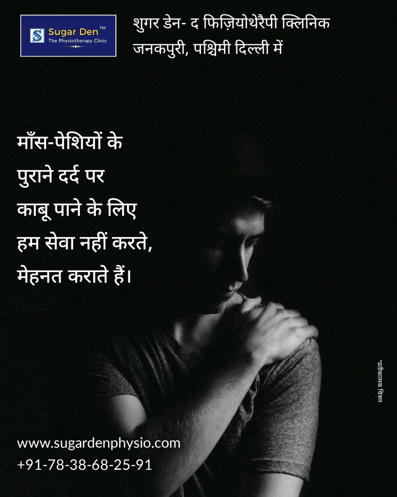 पश्चिमी दिल्ली की जनकपुरी स्थित शुगर डेन- द फिज़ियोथेरैपी क्लिनिक पर नब्बे मिनट तक की अपनी विस्तृत फिज़ियो जाँच का समय सुरक्षित करने के लिए यहाँ क्लिक करें
